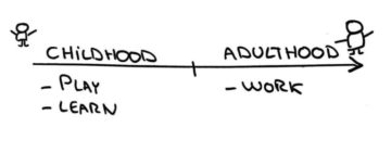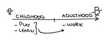 Alors que l’enfance est consacrée à l’apprentissage et à l’expérimentation, l’ âge adulte est considéré comme le moment où il faut exécuter et être productif. Jouer n’est plus considéré comme essentiel mais relégué au rang de loisir et de divertissement. Par conséquent, le jeu est fortement associé à l’enfance dans notre conscience collective.